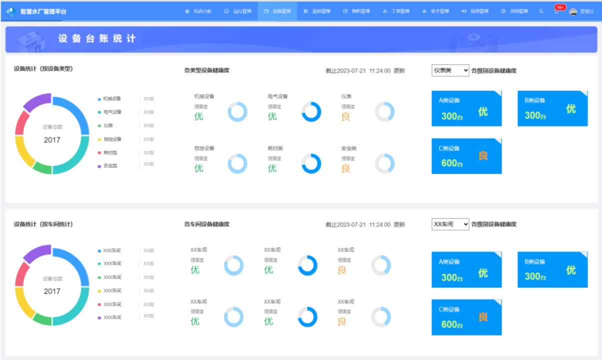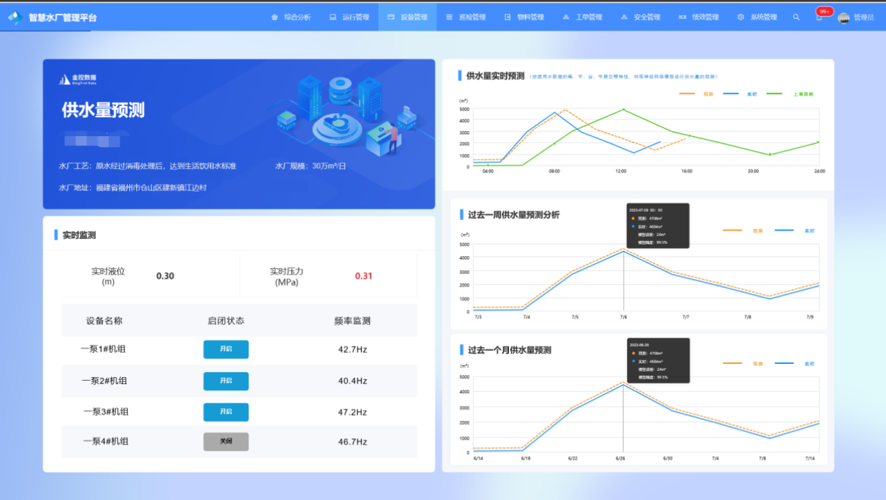 立足水廠管理者角度,通過一圖觀全局,了解水廠的水量、水壓、水質、泵組效率、泵站運行、能耗情況、設備健康情況、報警情況,保證水廠安全生產、透徹感知、平穩可靠運行。