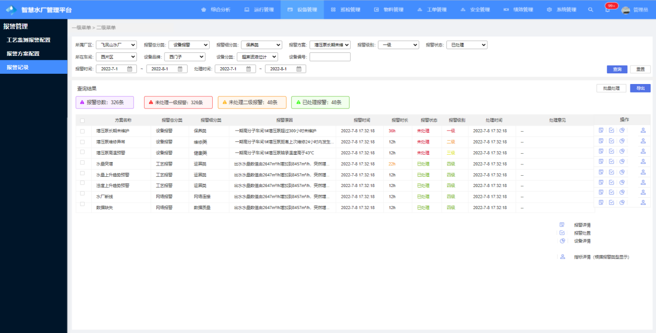 拉通水廠設備管理、藥劑管理、運行管理,提煉增加多種報警規則,對指標異常、設備巡檢質量、頻繁維修、設備健康度、泵組低效、藥劑余量、藥劑庫存、數據質量等進行告警,更有效的幫助與監督水廠運行調控。